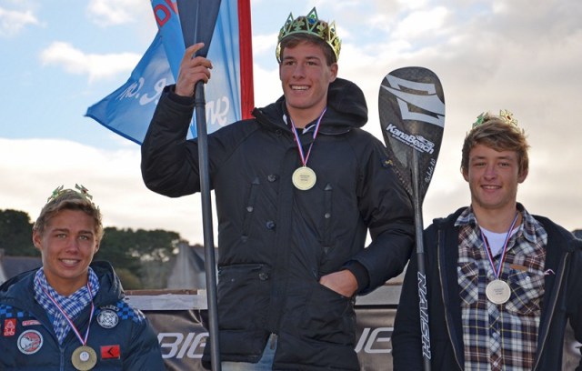 Pour la première année, un titre espoir était décerné, ce qui a permis une confrontation directe entre jeunes. Je n’ai participé qu’à l’épreuve de beach race mais quelle épreuve! Des vagues de 1m50 déferlaient sur la plage de Goulien et pimentaient les 2 tours à réaliser. J’ai pris un très bon départ mais n’ai pu éviter une chute dans les premiers mètres arrivant 4ème à la première bouée, Arthur Daniel a pu conserver l’avance qu’il avait dès le premier passage de bouée; derrière, à la lutte: Arthur Arutkin, Gabriel Bachelet et moi. Tout s’est ensuite joué au surf sur la dernière vague avant l’arrivée puis au sprint sur la plage, le tout à mon avantage…